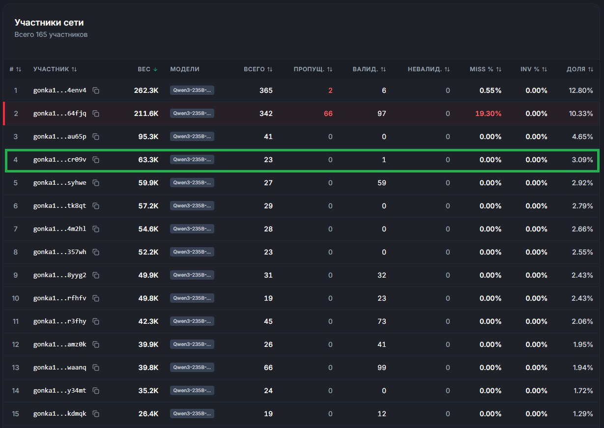 Прямо сейчас наша нода официально закрепилась на 4-м месте в глобальном списке валидаторов всей сети Gonka. Мы не просто участники — мы один из крупнейших узлов инфраструктуры искусственного интеллекта в мире.